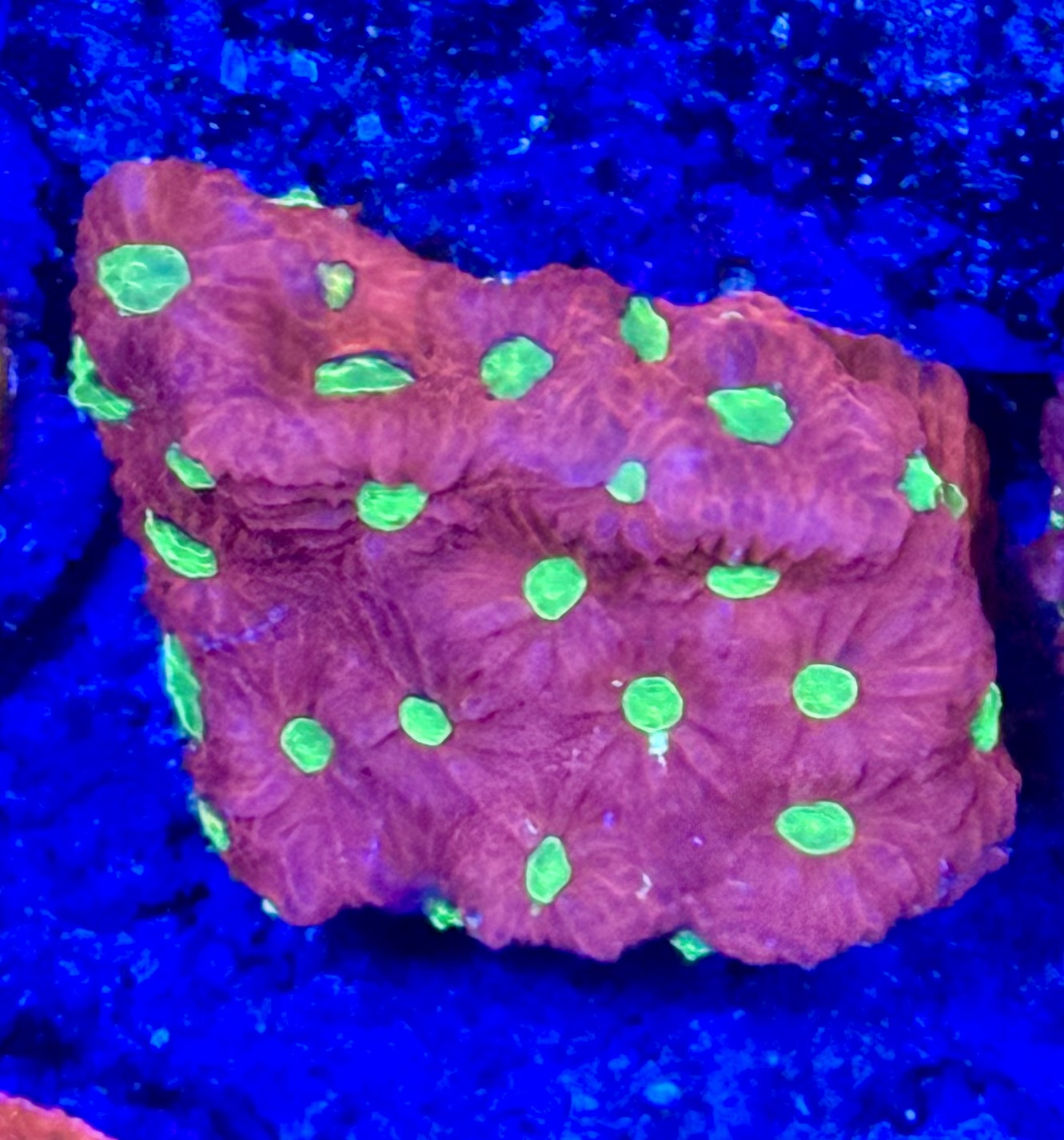 This vibrant Favites coral features striking red polyps with distinct green centers, creating a visually captivating and dynamic pattern. Well-suited for moderate lighting and gentle to moderate water flow, its bold coloration and hardy structure make it an excellent choice for adding a splash of color to any reef aquarium. Ideal for aquarists seeking a resilient and eye-catching coral.